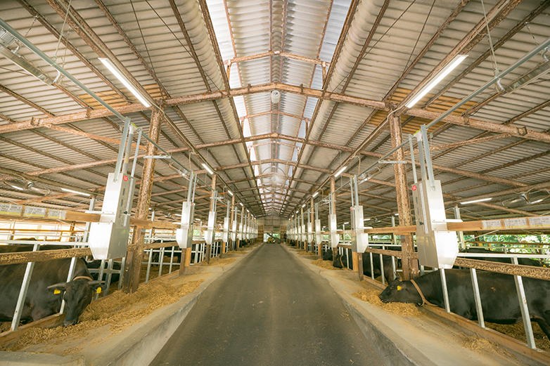 牧場所有牛棚皆為肝付町的木頭建造,使用當地加工木材廠產生的木屑成為牛隻膨鬆的墊料,不僅具有良好的隔熱、保溫與控溫功能並具有抑制牛隻壓力的效果。