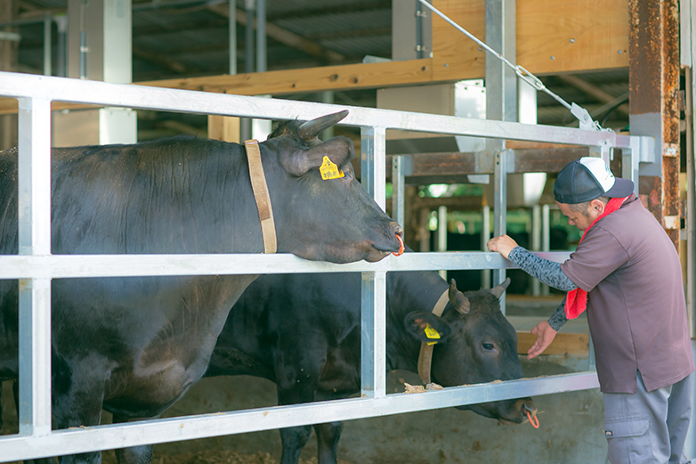 專研黑毛和牛的繁殖、培育養殖技術,新村社長對挑選子牛到飼育過程,擁有著一套獨門心法。用自家種植的牧草、稻米以及獨家配方的飼料,再加上無壓力的舒適環境,才能長出口感軟嫩及風味最佳的大理石油花,致力培育最上等且優質的A5和牛。