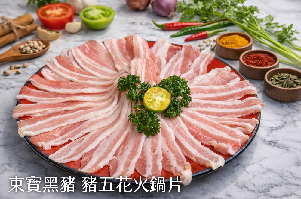 ※東寶黑豬五花火鍋片:150g/盤。脂香豐富、口感軟嫩,油脂在熱湯中化開,甘甜不膩。