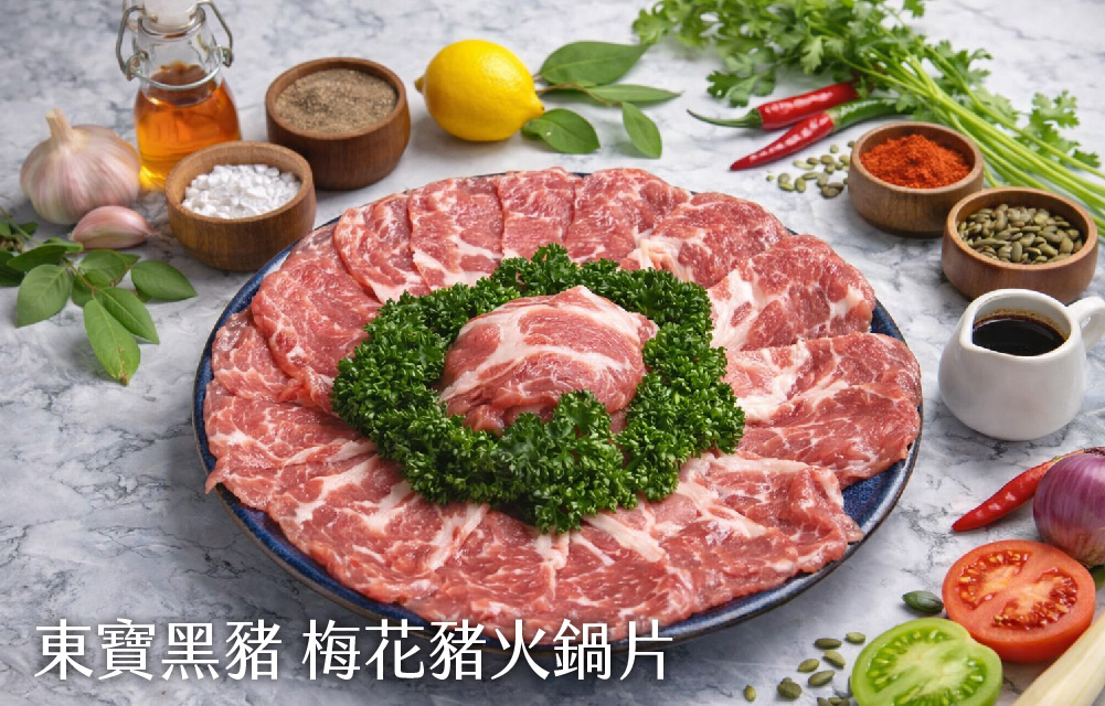 ※東寶黑豬梅花火鍋片:150g/盤。瘦肉與油花比例恰到好處,肉質鮮嫩細緻,豬肉愛好者的首選。