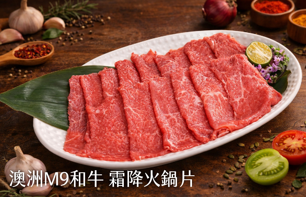 ※澳洲M9和牛霜降火鍋片:150g/盤。油花如雪花般細膩點綴,輕涮幾秒即可享受柔嫩口感。