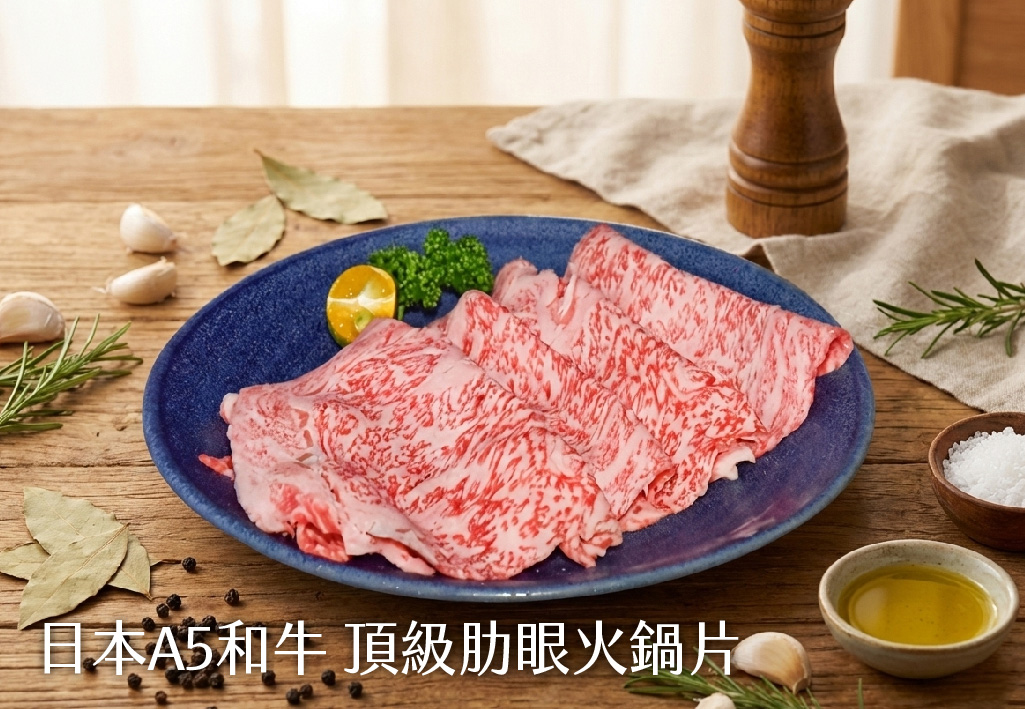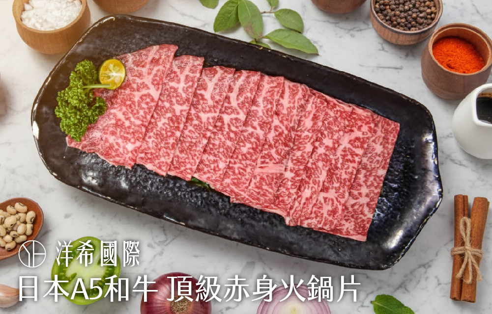 ※日本A5和牛頂級赤身火鍋片:150g/盤。日本排名最喜愛部位!肉質細緻柔嫩不膩口,品嚐和牛最純粹的高雅旨味。