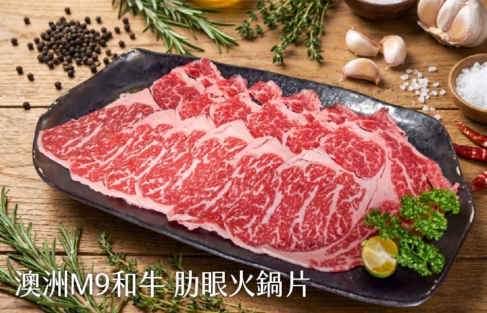 ※澳洲M9和牛肋眼火鍋片:150g/盤。肉感與脂香的完美平衡。肉汁奔放,每一口都是豐潤滿足。
